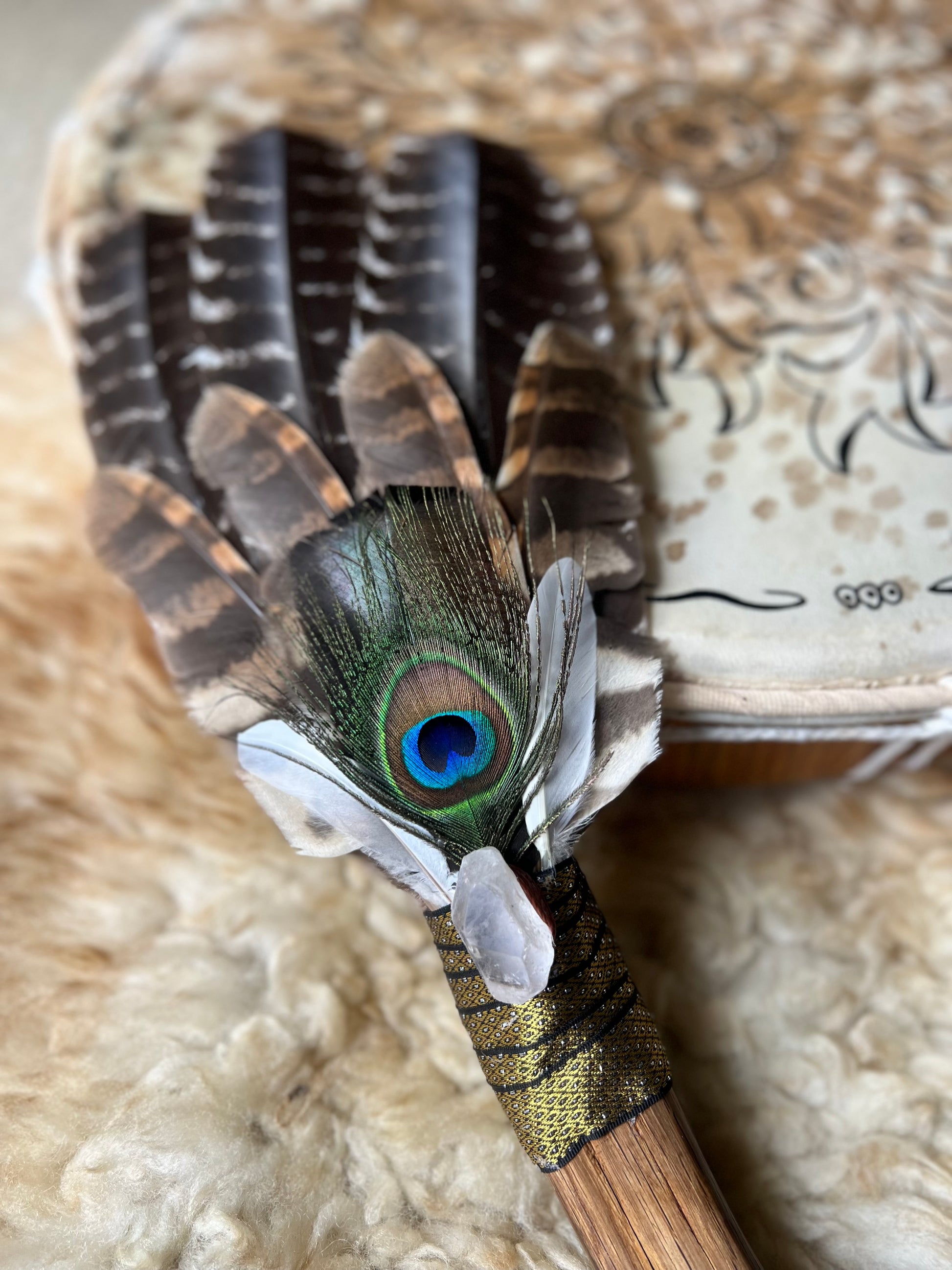 The feathers are turkey, owl, and peacock which bring a blend of wisdom, vision and beauty, carrying the energy of the Sacred Masculine.