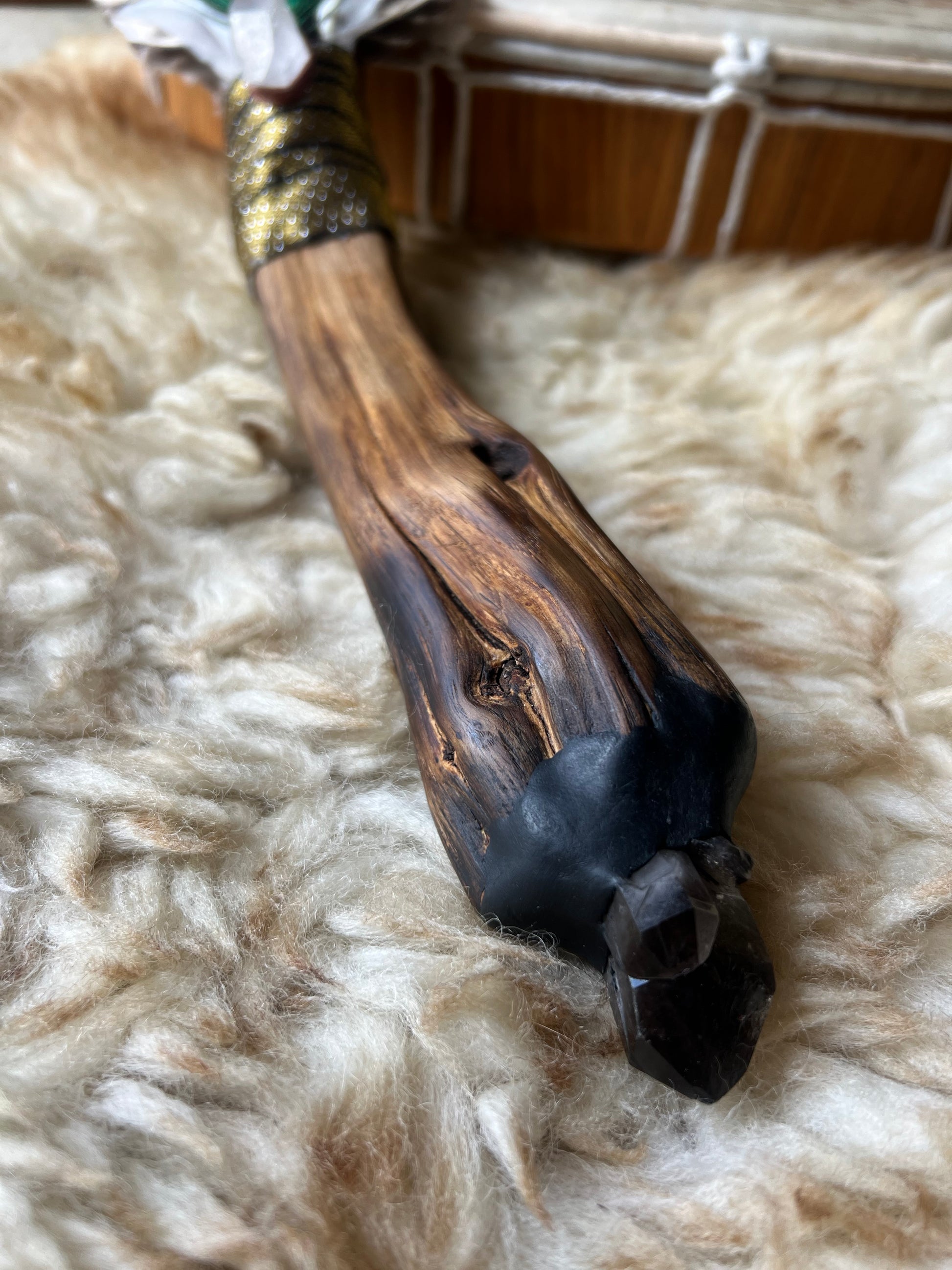 The wand is adorned with smoky quartz, clear quartz and black jet crystals, each chosen for their grounding, protective and clarifying properties.