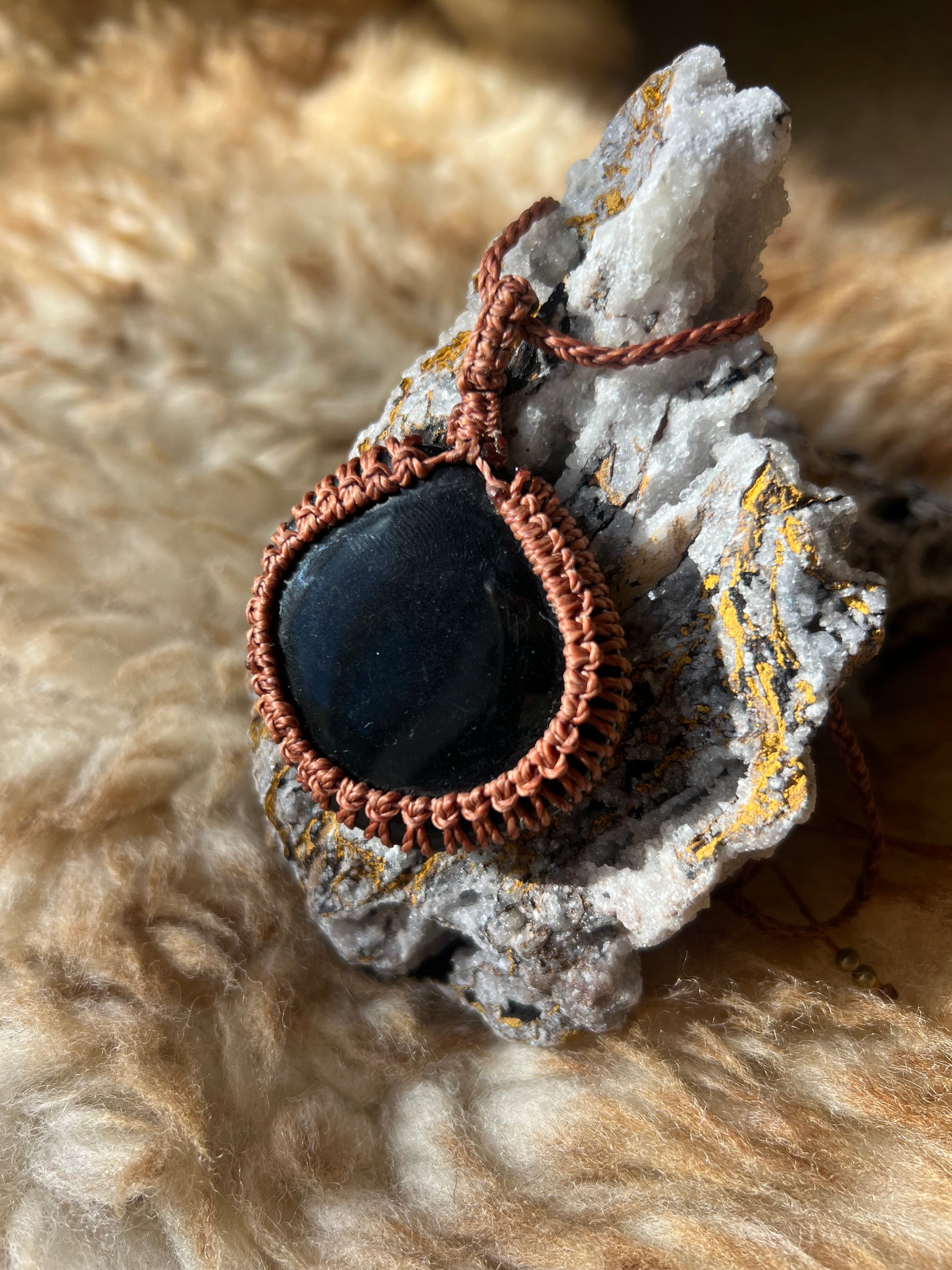 The design is formed from Obsidian crystal and waxed cord thoughtfully combined to create strong protective qualities, as it shields against negative energy, its grounding properties help to anchor your spirit to the earth, It is also used to release blockages,